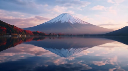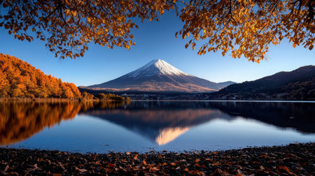 Mount Fuji's breathtaking reflection on a serene lake during autumn.