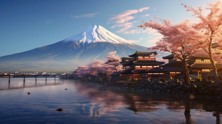 Beautiful japanese village town in the morning. buddhist temple shinto at sea river, cherry blossom sakura growing, mount fuji in background.