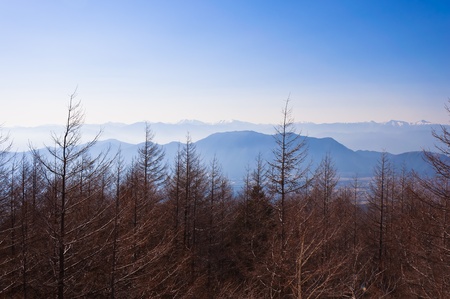 Natural landscape view of tree forest and mountain in the evening. The view is in Yamanashi prefectures, Japan.
