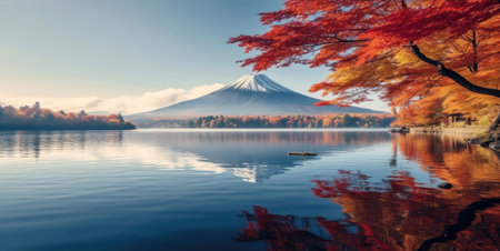Generative AI : Aerial view of Mount Fuji during koyo season from Lake Motosu Yamanashi Japan