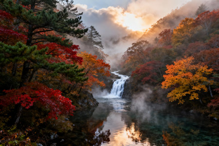 fall foliage of wolding river korea and hancheongnam captured in a stunning photograph. the image showcases reflections and mirroring, with nature-inspired motifs in light green and green hues. shot with a nikon f2 camera, this 32k uhd photo features an eye-catching composition. a masterpiece of professional photography, perfect for manapunk enthusiasts. discover this captivating image on unsplash. ai generated