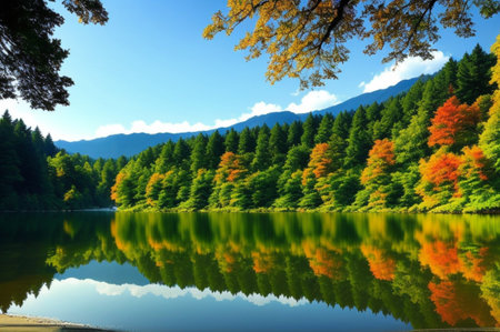 Serene autumn landscape with vibrant fall foliage reflecting in a calm lake