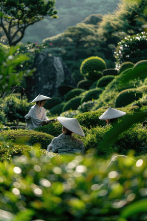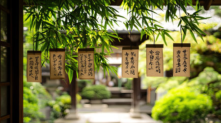 A serene Zen garden scene featuring hanging signs amidst lush bamboo foliage. The tranquil atmosphere invites reflection and meditative experiences in nature.