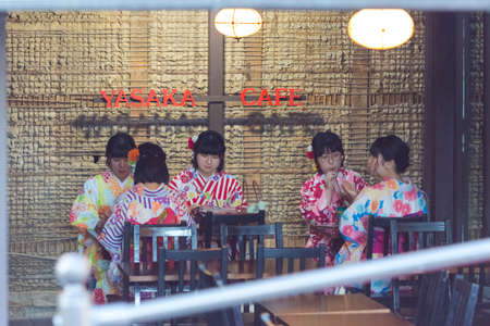 KYOTO, JAPAN - NOVEMBER, 8, 2019: Group of Young Japanese Girls Wearing Traditional Geisha's Kimono Dining At A Restaurant of Kyoto, Japan.