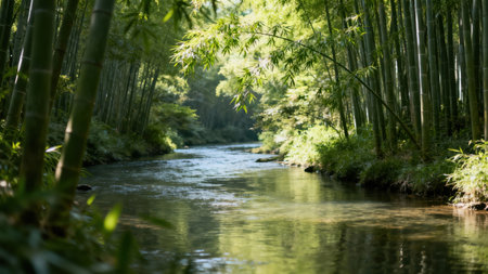 Tranquil view of a shallow, flowing stream bordered by tall, vibrant green bamboo stalks and lush foliage, highlighted by atmospheric morning sunlight filtering through the canopy.