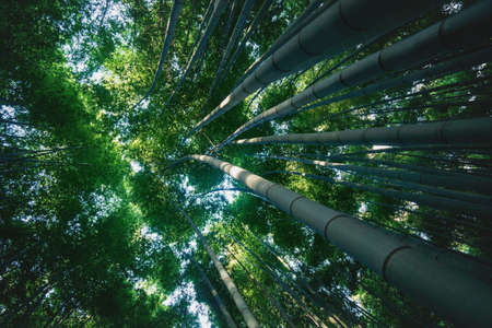 View into treetop of huge bamboo trunks in lush sunny forest at Arashiyama in Kyoto, Japan