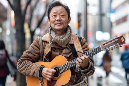 A man is playing a guitar on a street corner. He is wearing a brown jacket and a scarf