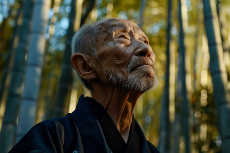 Portrait of happy senior Japanese man in traditional black kimono at beach