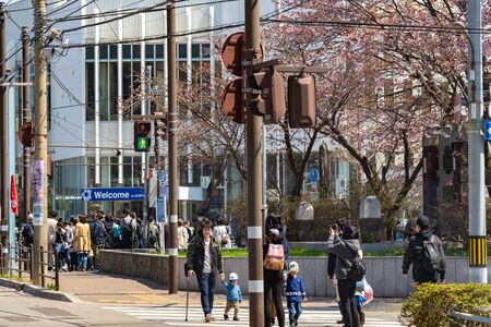 Hakodate cityscape in springtime sunny day cherry blossom full bloom season. The roadside is full of cherry trees, people enjoy it very much. Hokkaido, Japan