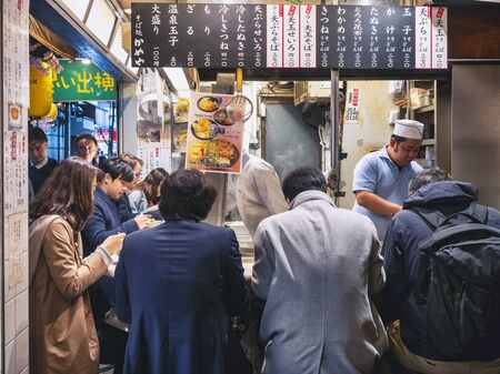 TOKYO, JAPAN - APR 24, 2019 : Restaurant Bar street Izakaya with businessman Front shop sign Japan Nightlife