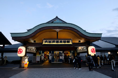 Tokyo,Japan-Dec.2019: Facade of Oedo Onsen Monogatari in Odaiba at evening. Famous hot spring resort in Tokyo