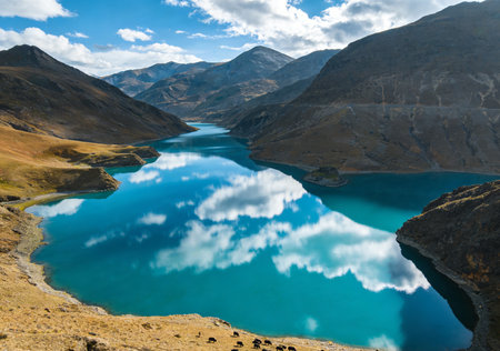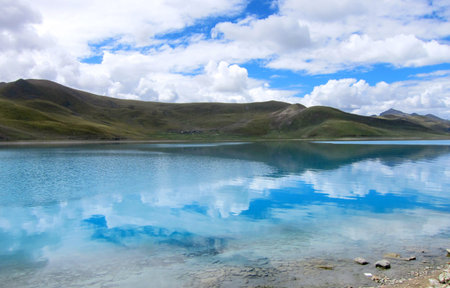 Beautiful reflection of hills and clouds in glass like waters of lake in Tibet, Asia