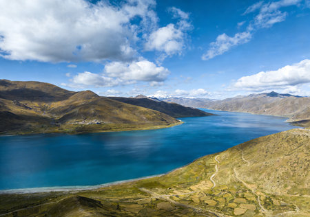 Yamdrok lake the fifth largest lake is in the highest land with mountains under blue sky and white clouds. Landmark of Tibet, China.
