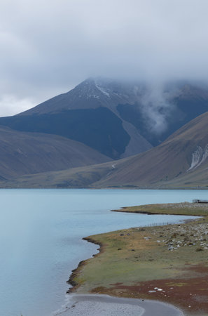 Yamdrok Lake with mountains under cloudy sky, Nagarze, Shannan, Tibet, China