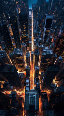 Aerial View of Busy City Street at Night, High-rise city buildings from a drone's view during twilight, AI Generated