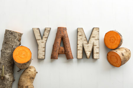 Word YAM made of wooden letters and vegetables on a white background