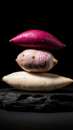 A vibrant, conceptual art still life of scrubbed exotic root vegetables (purple sweet potato, taro,