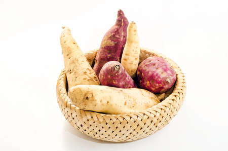 Various sweet potato in basket on wooden background