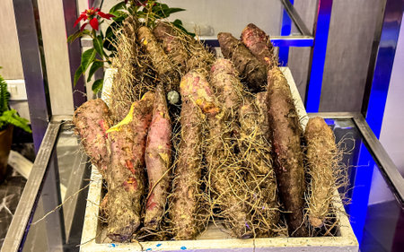 Raw sweet potato tubers for sale on counter. Vegetarian food concept