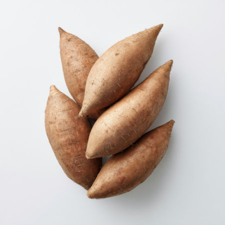 A collection of fresh organic sweet potatoes arranged on a clean white background, perfect for showcasing nutritional benefits and culinary versatility.