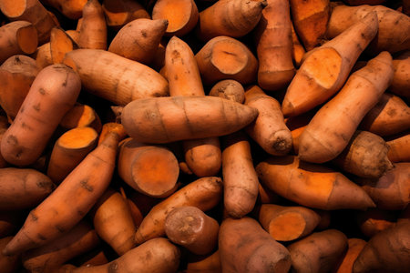 A visually appealing stack of fresh organic sweet potatoes offers a perfect representation of healthy eating and farm-fresh produce. Ideal for culinary use.