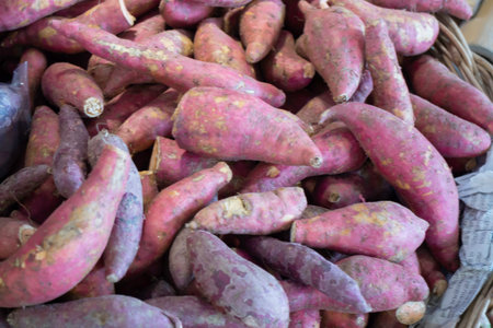 Close-up Sweet Potato purple peel yam raw many in market background