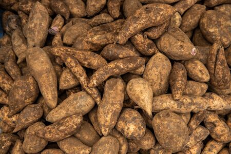 A pile of sweet potatoes sold at the market food ingredient background