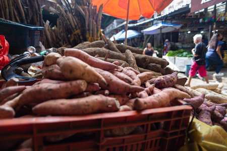 Fresh batata at small local urban market. Organic produce on sale at outdoor farmer market. Selling fresh crops and veggies harvest. Urban setting. Close up. Part of the series.