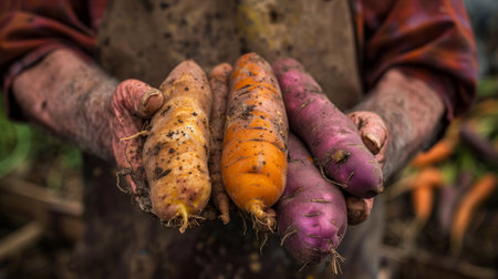 farmer holding carrots, oranges and purple sweet potatoes generative ai