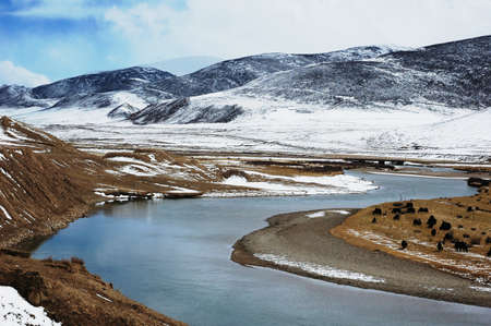 Landscape of mountains and river in winter