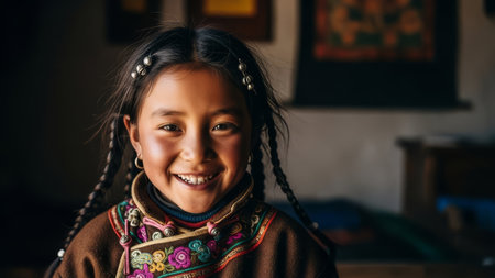 Smiling young girl, traditional clothing, braids, indoor setting