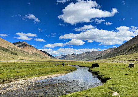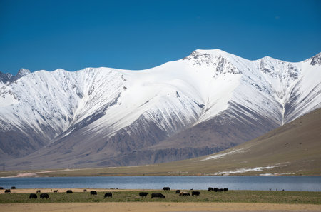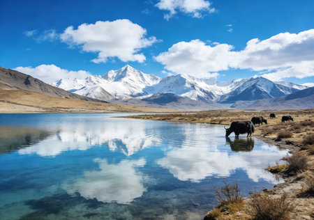 Mountain landscape with lake and cows in Himalayas, Ladakh, India