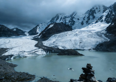 Night view on the glacier mountain lake. Akkem lake in the evening. Picturesque clouds and mountains reflecting in the lake surface.