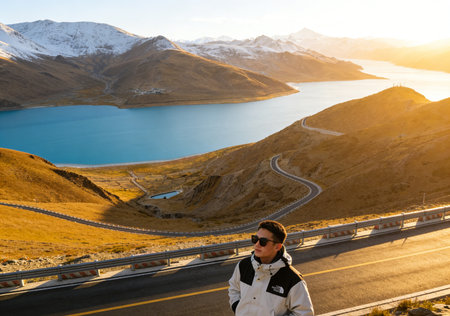 Man on the road near Lake Tekapo in New Zealand at sunset