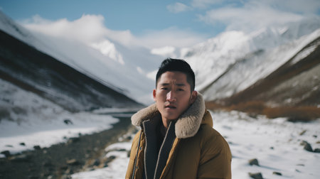 Portrait of a young Asian man in a yellow jacket standing on the background of snowy mountains