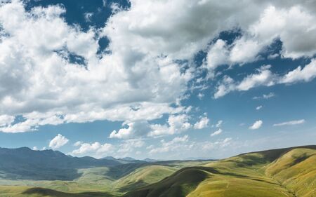 Remote highlands landscape with mountain peaks in the distance in Dagestan Russia