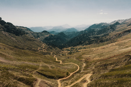 Aerial view of a path leading to an impressive mountain landscape in Turkey. Picturesque view