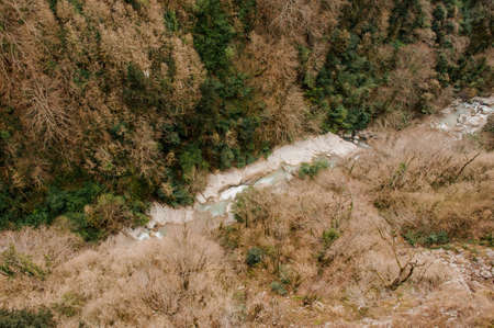 Top view of a beautiful forest river flowing among yellow and green trees in Georgia