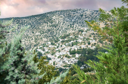Greek traditional white houses with stone roofs in Panagia town, central Thasos Island, Greece