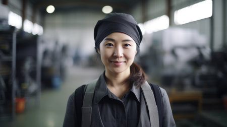 A smiling Chinese female factory worker standing in metal sheet factory. Generative AI AIG19.
