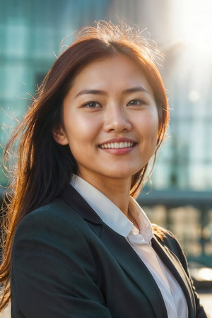 Portrait of Asian woman in a business suit is smiling and looking at the camera. She has long hair and is wearing a white shirt underneath her jacket