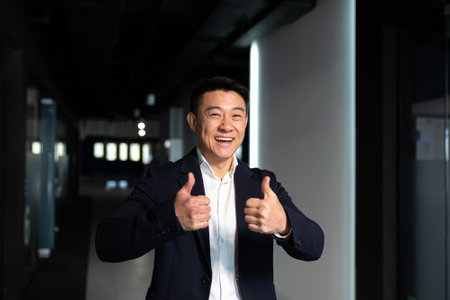 Successful businessman rejoices looking at camera shows thumbs up and signs ok, asian boss happy and laughs