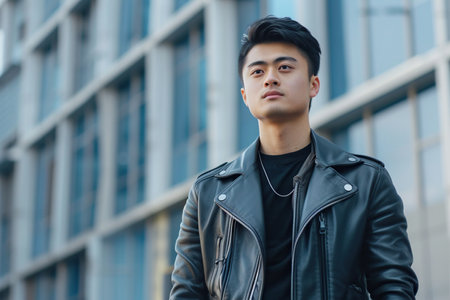 Confident Japanese man wearing an elegant leather jacket standing in business district. Concept of Entrepreneurship, wealth building and Ownership