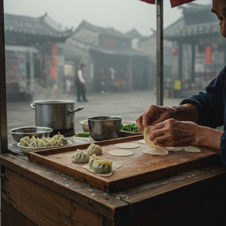 Traditional Chinese dumplings on a wooden table in a street restaurant
