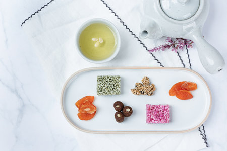 Japanese Wagashi A variety of intricately designed wagashi with a cup of green tea