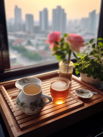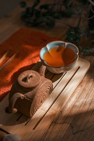 Enjoy a serene Tea Ceremony with an elegant teapot and cup on a bamboo tray, showcasing beauty