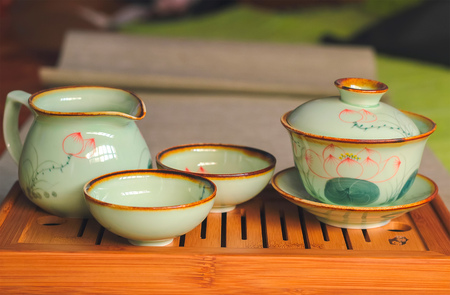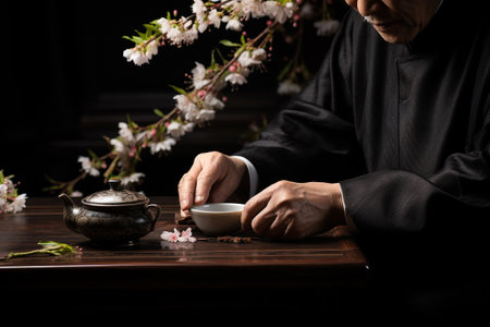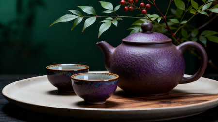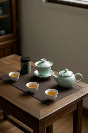 A serene tea ceremony setup with traditional teaware, promoting relaxation and socializing