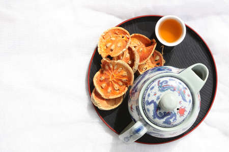 Dried leaves of Chinese tea in a beautiful kiramic soda. Tea ceremony. Red traditional Chinese drink. Dark utensils.