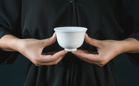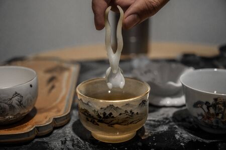 Traditional tea ceremony. Porcelain figurine. Antelope figurine. Cup of tea.