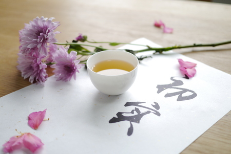 A serene tea ceremony scene featuring rustic wooden elements and elegant cups. The combination evokes a sense of calm, tradition, and beauty in simplicity.